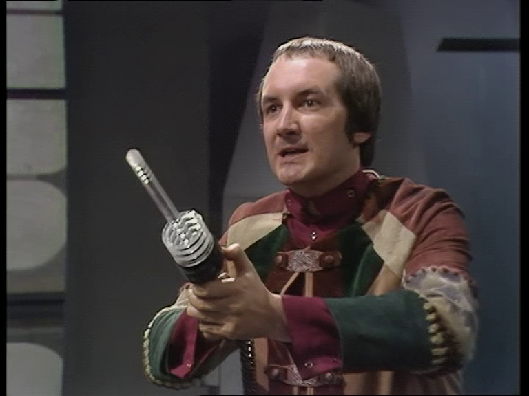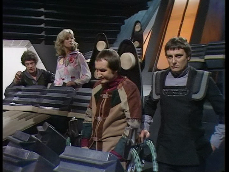 Avon heads off with a bag of tools to begin prodding around in a computer room. This isn’t the first time we’ve seen him poking around a ship’s particulars. I must be used to it from other programmes because it’s taken me a while to realise that a lot of Avon’s technological adjustments are physical, manual ones, as opposed to computer coding. It’s odd to see this contrasted with the small circuitboard for Gan’s limiter. I was also impressed with Cally’s wireless headphones that enable her to hear the others from the flight deck. Blake’s 7 has a strange crosssection of technology from a time when microprocessing was just beginning to come into more people’s daily lives but analogue technology was also still very prominent.