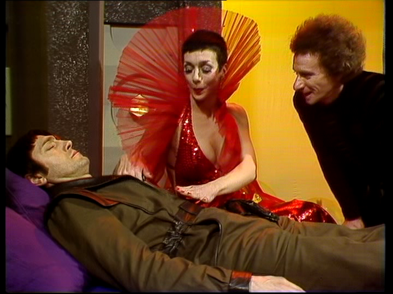 Servalan looks utterly stunning in Gambit. Her red dress is revealing and outlandish, for once perfectly suited to her surroundings, and I could hardly take my eyes off her. I love how over-the-top most the women’s makeup is in the Blake’s 7 universe, but I felt this episode gave us even more for Servalan, including a pile of silver, glittering eye shadow. After being introduced to her laid out in the casino, Krantor invites her, “Pray! Be seated!” and she carefully lounges herself across the enormous bed in Krantor’s boudoir, providing us with one of several lingering shots of her outfit.