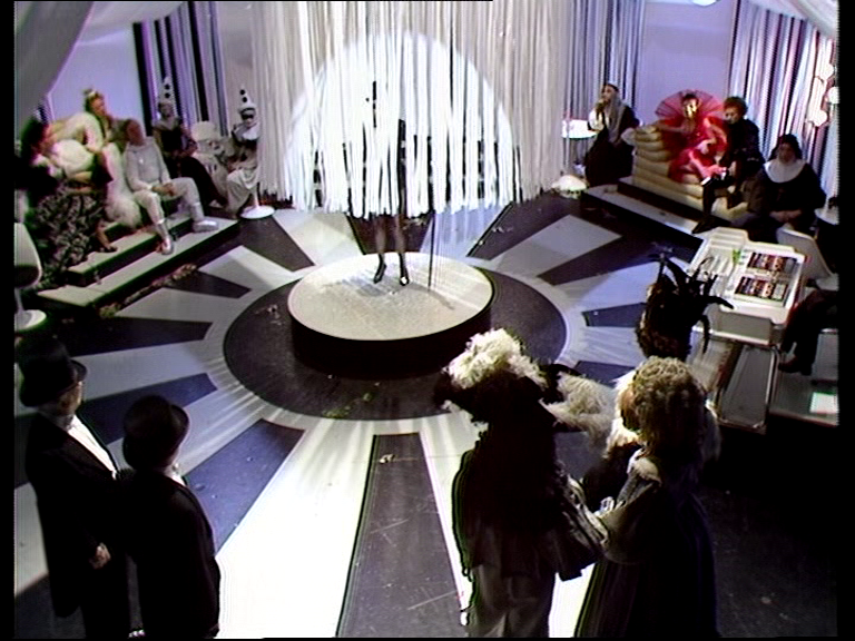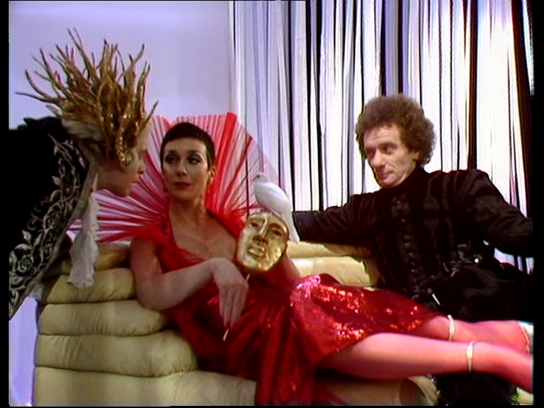 My historical knowledge isn’t very comprehensive, but Krantor and Toise’s outfits seemed like the French Revolutionary period. Krantor says his costume is supposed to be modelled on the Prince Regent, and thanks to Blackadder III I know there is some crossover there. Krantor is vague about who the Prince Regent actually was and describes the casino’s theme as simply “the spirit of carnival”. This is nicely all-encompassing for the variety of outfits on display, particularly in the Speedchess chamber. The croupier wears a type of black-tie, while sitting among the patrons are clowns that reminded me of David Bowie’s Ashes to Ashes video. Servalan’s face is hidden behind a mask at first, but her outline was instantly recognisable.