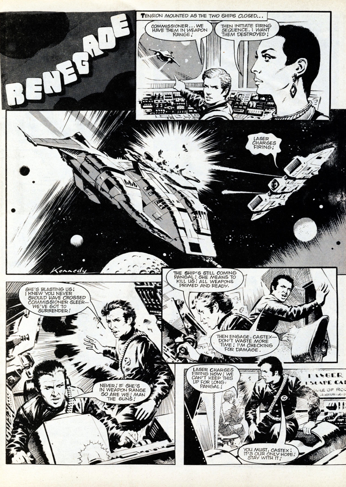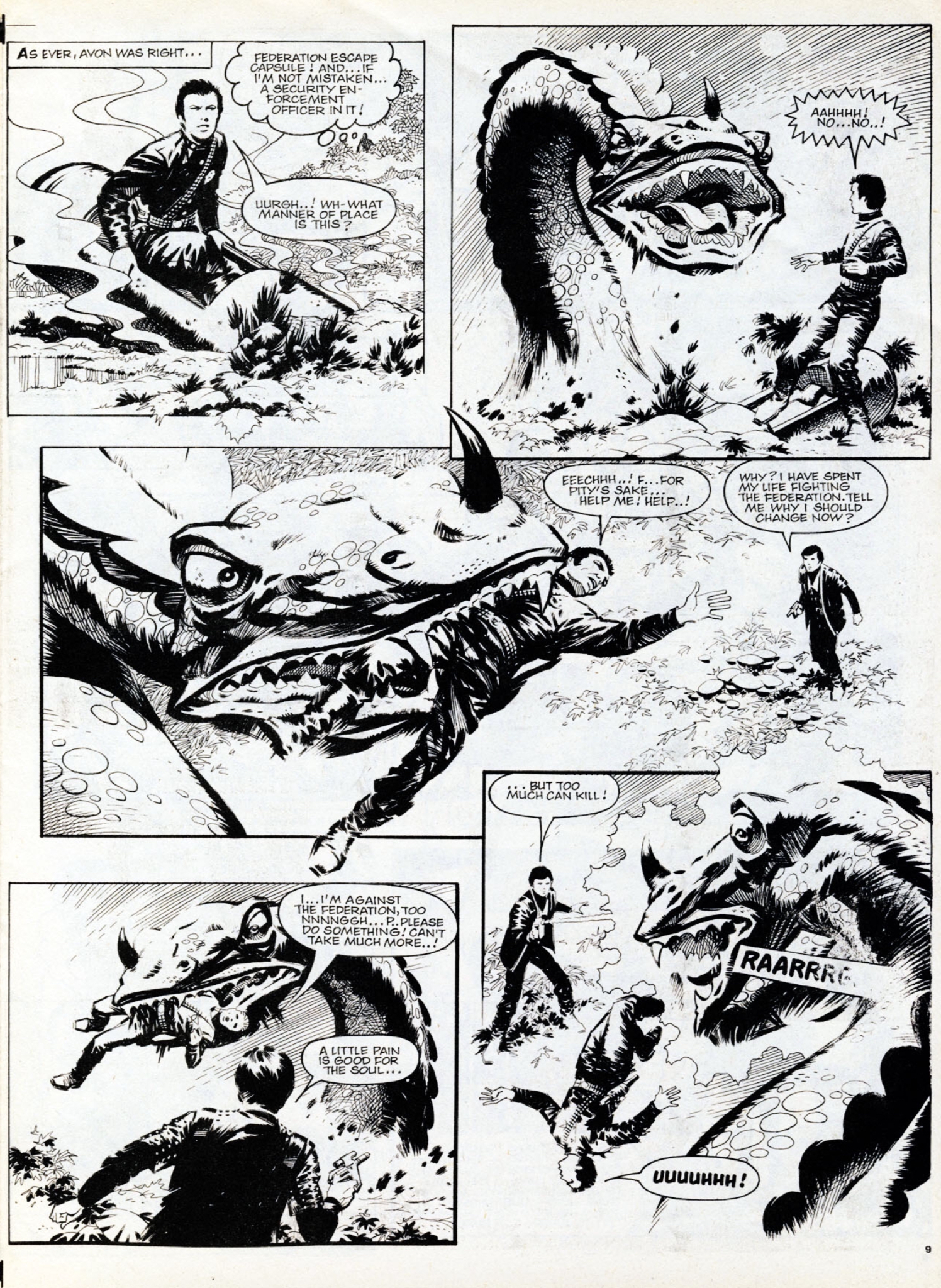 An exciting opening to this month’s comic has two Federation officers being pursued in a ship by Servalan. Pangal betrays his colleague, taking their ship’s escape capsule before landing on Xenon. He’s rescued by Avon, who soon regrets it when Pangal tries to turn the crew over to Servalan in exchange for a pardon. The crew overcome Pangal and make a hasty escape, realising they can’t return to Xenon until Servalan has disappeared.