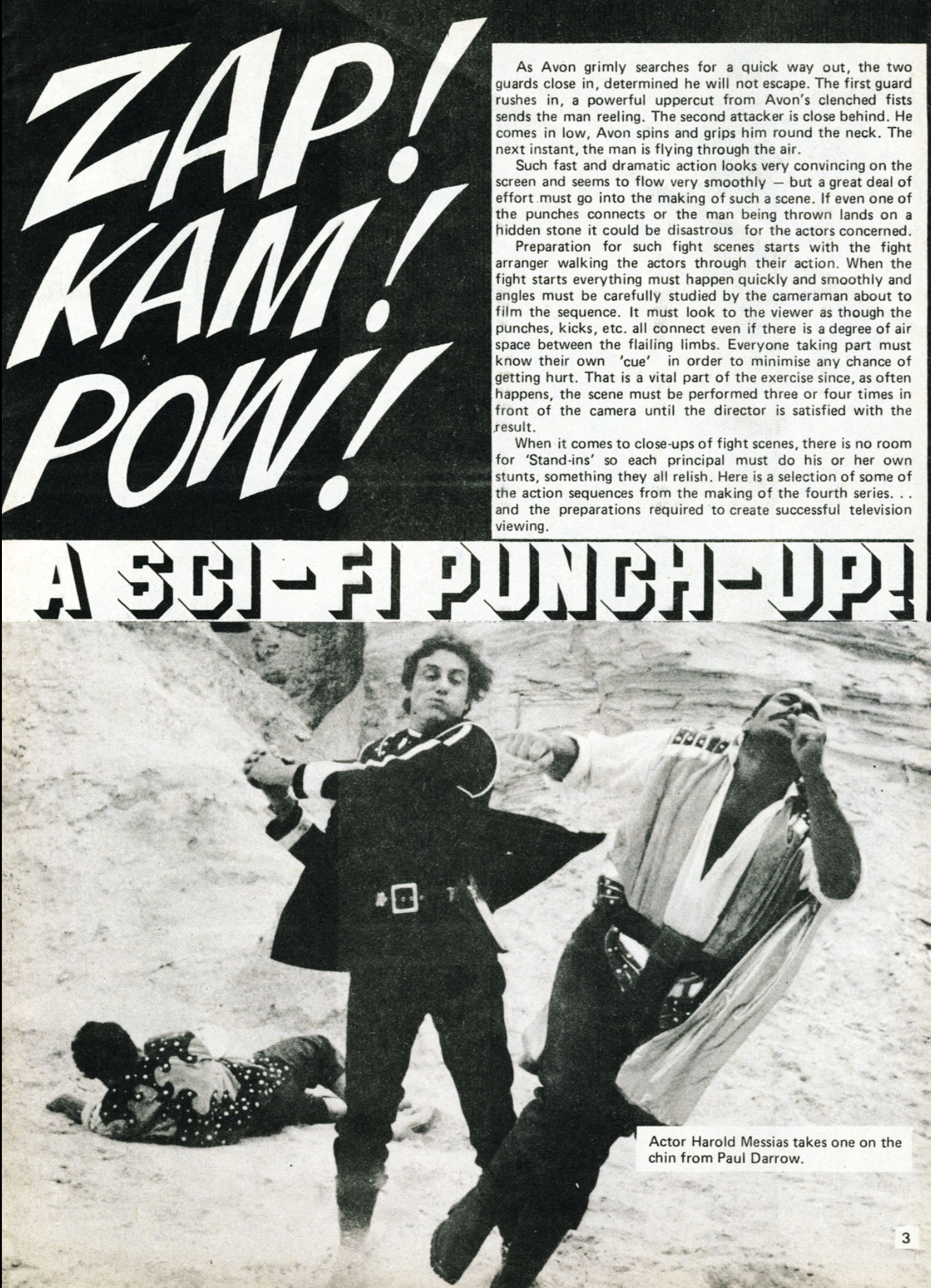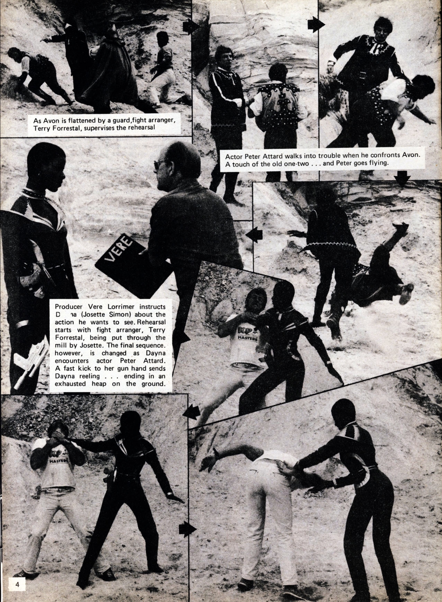 The opening feature provides us with some behind-the-scenes action shots from several fight scenes. Few of them are particularly clear really, though I’m unsure if it’s the camera adjustments or simply my magazine scans that means it’s difficult to make out Josette Simon’s features. These rehearsal images do feel a bit static and the angles aren’t fantastic, but I think the first one of Paul Darrow chinning Harold Messias is super. I also love that we can see producer Vere Lorrimer’s clipboard with ‘VERE’ spelt out in what appears to be either masking tape or Tipex.