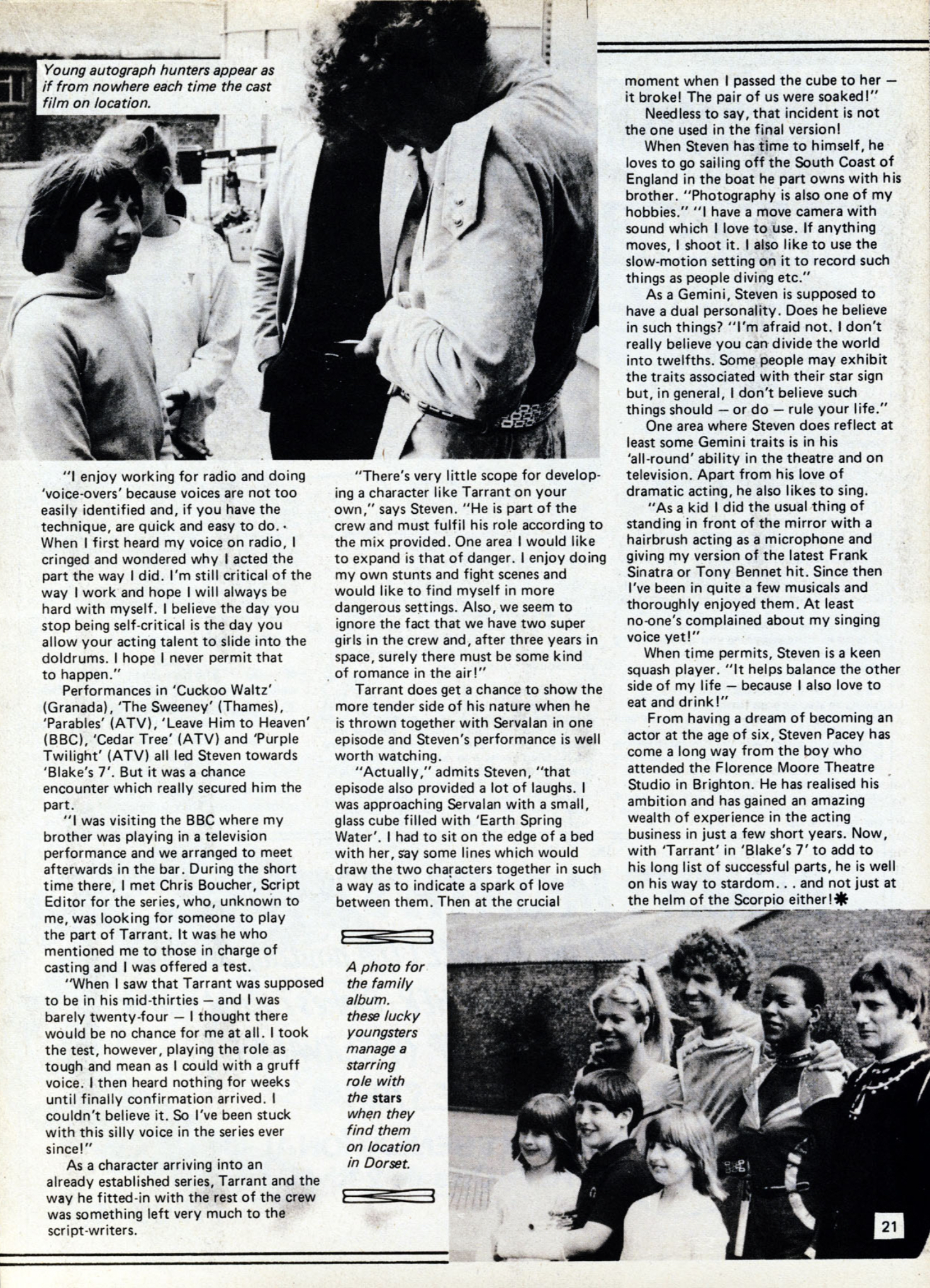 Star Portrait/Star Profile – the magazine doesn’t seem entirely sure which title to go with for its cast interviews. Steven Pacey is this month’s choice and therefore also occupies the centrefold’s pull-out poster. While I’m sure a few fans were pleased, I do think the editor is missing a trick as we haven’t had a poster of any of the female crew yet…