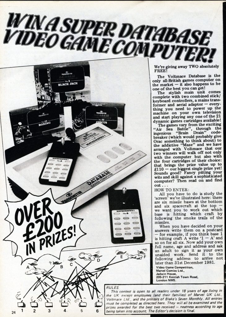 The reason I haven’t heard of a ‘DATABASE ELECTRONIC VIDEO GAME COMPUTER’ is that it isn’t the item’s actual name. Blake’s 7 Monthly is in fact giving away a Voltmace Database.