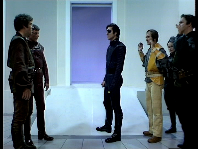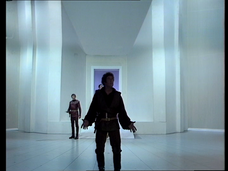 I had mixed feelings about the direction all episode, which is courtesy of George Spenton-Foster. There are several scenes where I thought I should be seeing something else or have a shot from a different angle. In this one, with Blake on his knees, there is a missed opportunity to point the camera up at Travis and have him gloating down at us. Instead, we get a profile shot of his eyepatch side and I feel we are missing something. When Servalan appears, all of Travis’s dialogue is from offscreen as we don’t cut away from her at all. I began to get the impression that the episode was on a tight schedule either throughout or at least by this scene.