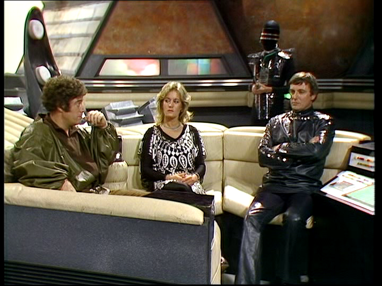 I never got round to mentioning all the flares in Series A – oh the faith they had that this fashion trend would last down the centuries! I’m desperate to see an automatic door trap someone in Blake’s 7 due to their flares. Avon’s outfit in Redemption includes flared trousers, but that is the least important thing to comment on. Avon clearly spent a lot of Series A looking at Travis’s all-black leather Federation uniform, thinking, “I like black and that’s an exceedingly practical ensemble.” With the Federation logo emblazoned across his chest and similarly-dressed guards by his side, Travis could pull this look off. However, in full black leather and silver studs, Avon is halfway between a motorcycle gang and a fetish club. I don’t mind, it’s just I had never imagined him swaying either way.