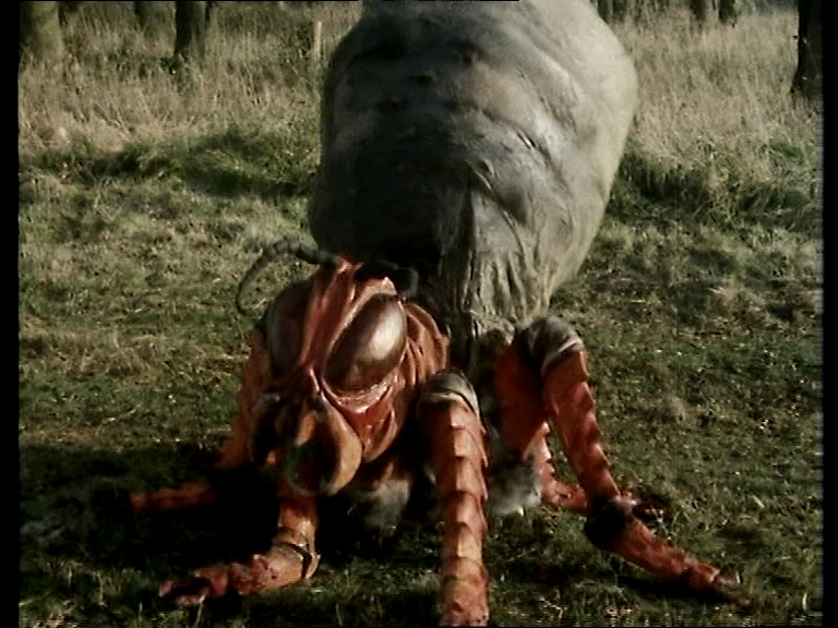 I can mumble about being forgiving of BBC budgets or just admit the spiders look crap. As I attempt to imagine how they might have been described in the script, it seems unlikely that anything decent was ever going to emerge. However, I think it would have been worth attempting some script surgery to ensure the spider was only seen at night and perhaps within the forest, as surely this could have hidden more than shooting it in the open during broad daylight? We don’t linger on the spiders’ victims – neither visually or textually – and when we finally see one of the perpetrators, any previous fear from the mystique of Kairos is completely eroded.