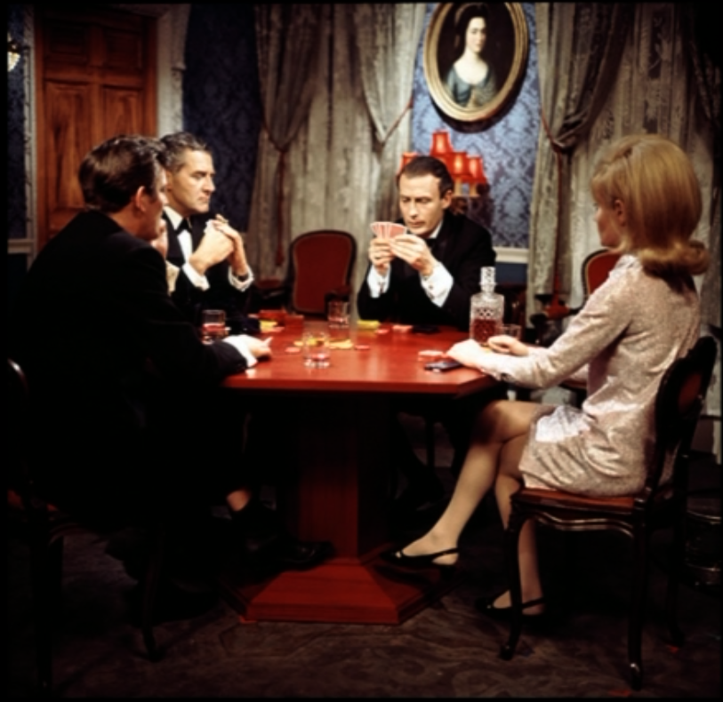 Edward Woodward’s hands are holding up his cards, so we can’t clearly see if, like Lindale and Miller, he’s worn a full dinner suit that evening. It would be appropriate for the visit to Barlows, where Hunter had commented on Callan’s outfit. When discussing gambling clubs with Lonely, Callan asked about “ones where you have to wear evening dress” and Lonely said Barlows is the poshest. Callan certainly looks like he’s wearing a white shirt so I’m inclined to think he might have done.