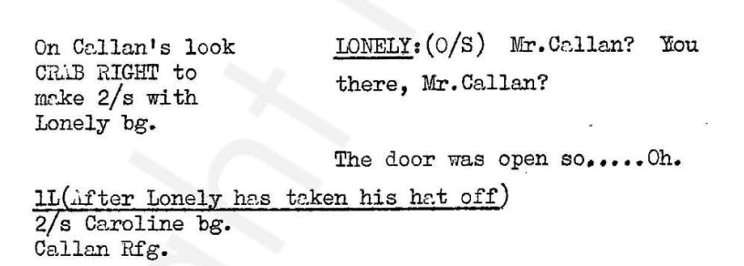 Compared to others, the camera script for But He’s a Lord, Mr Callan has slightly more information about visual action. Generally, this is because they are instructions in relation to specific onscreen actions – either to switch cameras or for camera movements. Happily, this means we know that Lonely takes his hat off when he walks into the library at Bootwood Hall and clocks Caroline with Callan.