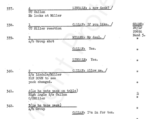 The first time, it’s Callan’s deal but he asks Miller to deal for him. As Miller does so, Callan seems to be pouring himself more whisky – part of their ploy to make him look sozzled. This could have been the distraction as Miller swaps packs. Yet I don’t think this scene actually shows us what Miller is doing as the shots aren’t right. This is only Part One of the episode and there would certainly have been some added intrigue if the audience were left guessing how Callan and Miller are doing it.