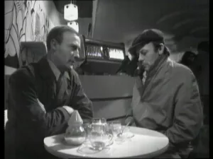 Later, Callan meets Lonely in a late-night café. Callan has clearly been kept waiting a long time as we can see six empty cups on the table! I’m presuming they were tea rather than coffee… When Lonely does arrive, Callan berates him, “You might have poshed yourself up a bit before you come in a place like this.” Presumably this is because it is supposed to be a smart café bar, which we’re told is around the corner from Joan’s Chelsea flat.