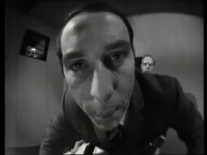 Several camera techniques are used for POV shots. A fish eye lens gives us the imposing sight of Meres leaning over the half-conscious Horst. Hunter appears with a normal lens, but at unusual angles that slowly move, and he keeps going in and out of focus. We see Horst blinking and straining his eyes, trying to focus. It’s combined with an echo effect on Hunter’s speech.
