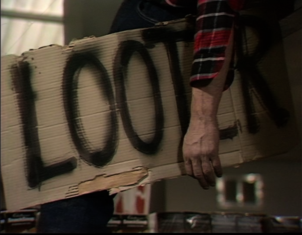 I’m surprised the supermarket is still so well stocked, but we soon find out why. We don’t really see the body in full, although the large LOOTER sign is perfectly clear. The swinging legs are enough. I’m shocked and I don’t entirely believe Arthur Wormley’s gang later when they say they found the corpse down the road. Why is the corpse inside the building, rather than right by the door? It feels like they are testing people: will they still leave things behind once they have been in and seen and touched the food?
