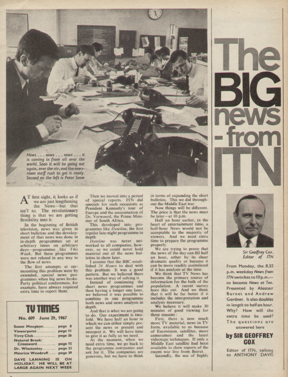 This week, colour has arrived on British televisions! But alas, that means absolutely nothing here as it was only for BBC2. Independent Television would have to wait a while longer yet. The BIG news – from ITN The new arrival on Independent Television this week is News at Ten and this itself is quite a big …