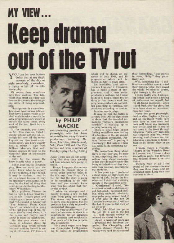 My View… Keep drama out of the TV rut Producer and scriptwriter Philip Mackie enthuses about the continuation of the television play. Looking through schedules for this period, there are plays in abundance. There are one-offs and more so, there are those under what Mackie calls ‘omnibus titles‘. He names Love Story but there is also …