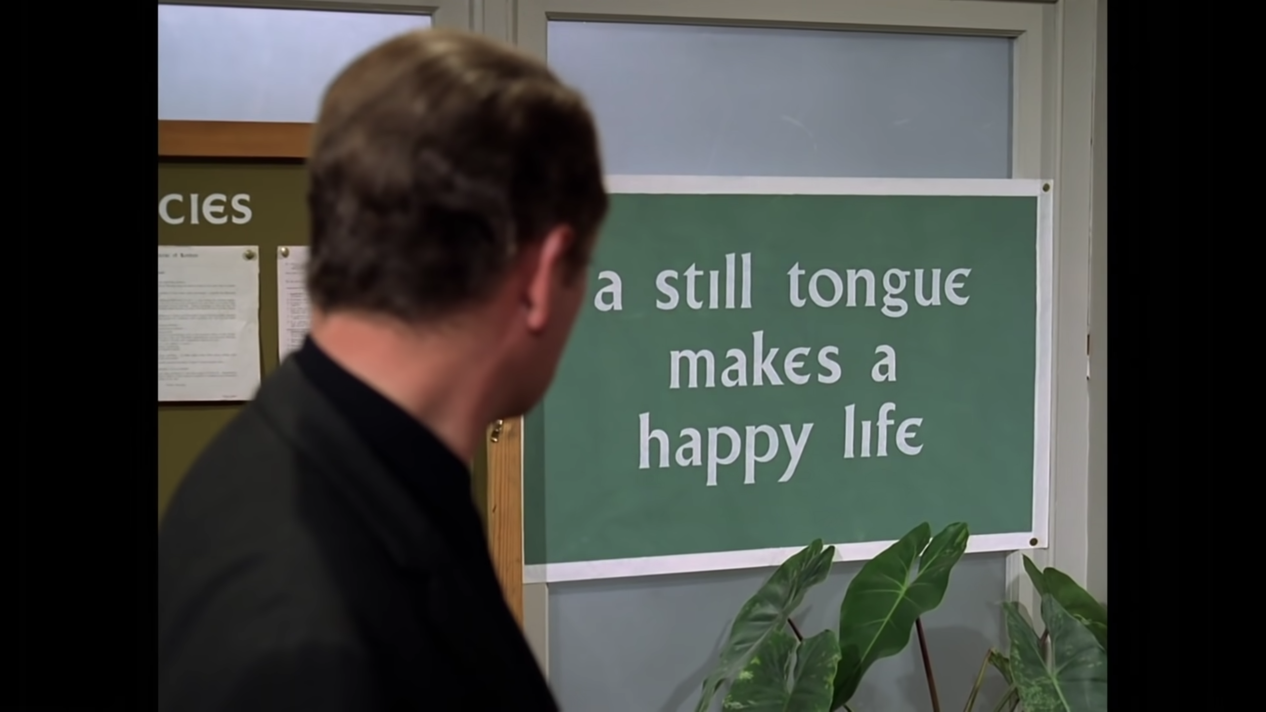 I really like the oddities in the Village. It is clear that someone somewhere has thought about them and they really do fit in. They make the Village seem very realistic. I have seen many ‘Keep off the grass’ signs but the Village has a ‘walk on the grass’ sign instead. The signs inside the Labour Exchange are undoubtedly Orwellian-inspired: ‘a still tongue makes a happy life’; ‘questions are a burden to others, answers a prison for oneself’; ‘humour is the very essence of a democratic society’. The last one particularly intrigues me. The Village is a very happy place considering everyone there is a prisoner. There are the bright colours, the upbeat music, the parades, and lots of smiling, laughing faces. The village is happy but it is an enforced happiness; you cannot turn off the radio in each house and when it is broken, someone immediately comes to fix it, lest you be too long without the incessant trumpets. When you leave the house the music and announcements blast from outdoor speakers too. After awaking in the hospital Number Six asks for his clothes only to be told “They’ve been burnt.” “Why?” “I’ll take you back to your ward.” Once again awkward questions simply are not answered. When he comes to leave the hospital Number Six has been given new clothes and in future these will be all he finds in his wardrobe. He immediately takes off the straw boater and removes his number badge. But nonetheless, his new clothes make him part of the village now. The humour in the enforced jollity is anything but democratic. A darker humour comes into play when the new Number Two (George Baker) ensures a joke is played on Number Six.