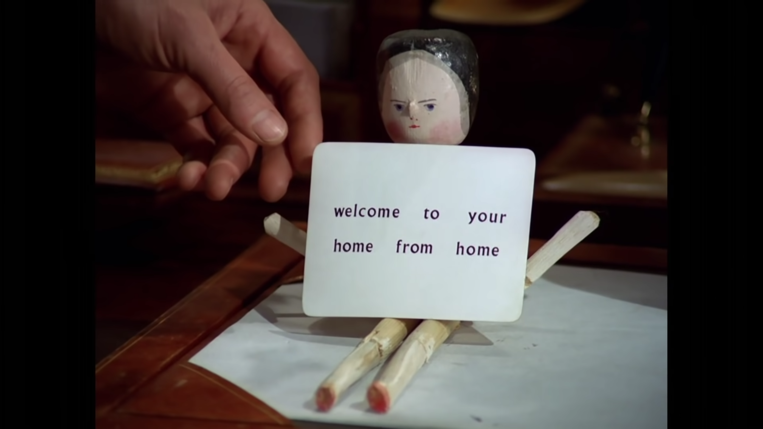 The man visits the village shop and looks at a map entitled ‘your village’. When he returns to his house there is a note that reads ‘welcome to your home from home’. It serves to reinforce that he lives there now and it is his new home.