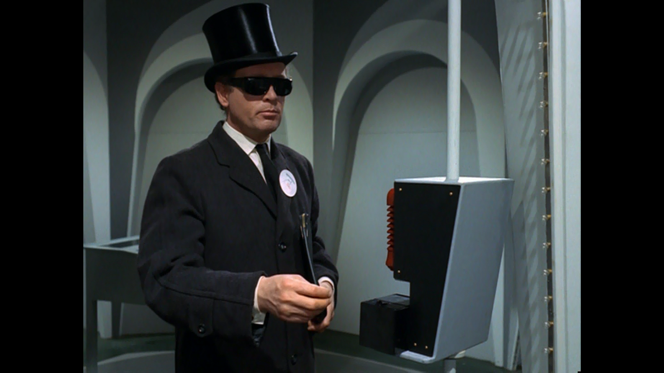 There a lot of men in black suits, top hats and black shades. If it wasn’t for the shades they would look like undertakers and if it wasn’t for the top hats they could be Men in Black. They are all asking to enter a Lecture Approval Session and putting one of the chips into a machine. Think ‘Thing’ from the Addam’s Family because this is what it was inspired by. A little hand reaches out and takes the chips, allowing them through. Number Six is also dressed up, wearing the Number 56 badge, and hangs around before doing the same with one of his own chips. He heads to the projection room, taking out a couple of guards on the way, who are dressed up like US military policy. Whilst taking out the projectionist (Peter Bourne) Number Six gets a cut to his hand. There’s a machine with thin tubes and Number Six removes a metal rod from the pen Number 12 gave him, then inserts it into one of the tubes.