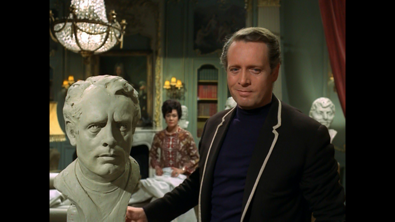 Number Six sneaks inside a building nearby. A room is filled with plinths, covered in white sheets. The Professor’s wife appears and says “This is a private room.” Number Six begins to remove the sheets, revealing busts underneath. One of them is of a Number Two, previously seen at the arts and crafts fair in ‘The Chimes of Big Ben‘, another is of the current Number Two and then…one of Number Six. Suddenly Number Two appears, as does a doctor (Conrad Phillips), who earlier we saw leading the Professor away from his typewriter in an office-type room. The doctor says the Professor is not be disturbed and we see him lying in a bed in the next room. Number Six has picked up a club and bashes the Professor’s face in, which is fine, because it isn’t really the Professor. It’s just a hollow sculpture. I feel like I am missing something as the reason for this is never explained, nor for any of the other sculptures.