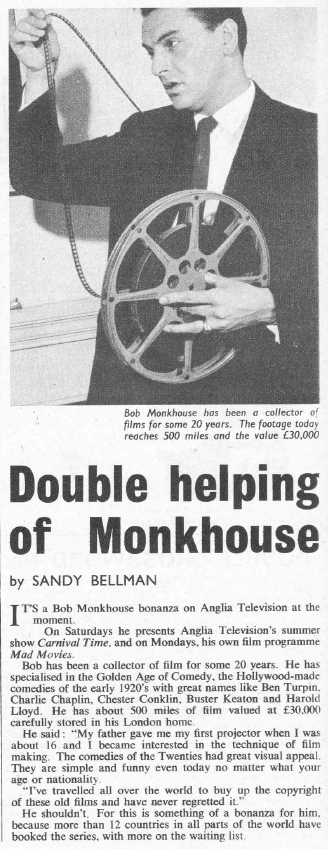We are informed Bob Monkhouse ‘has about 500 miles of film valued at £30,000 carefully stored in his London home‘. That is approximately half a million pounds today. However, this is only the start. Bob Monkhouse would continue to grow his archive, moving on to videotape and amassing an enormous amount of television programming. He undoubtedly made a fantastic contribution to film and television archiving. Some of his items have become the only surviving copies and the Bob Monkhouse Collection is now part of the Kaleidoscope Archive.