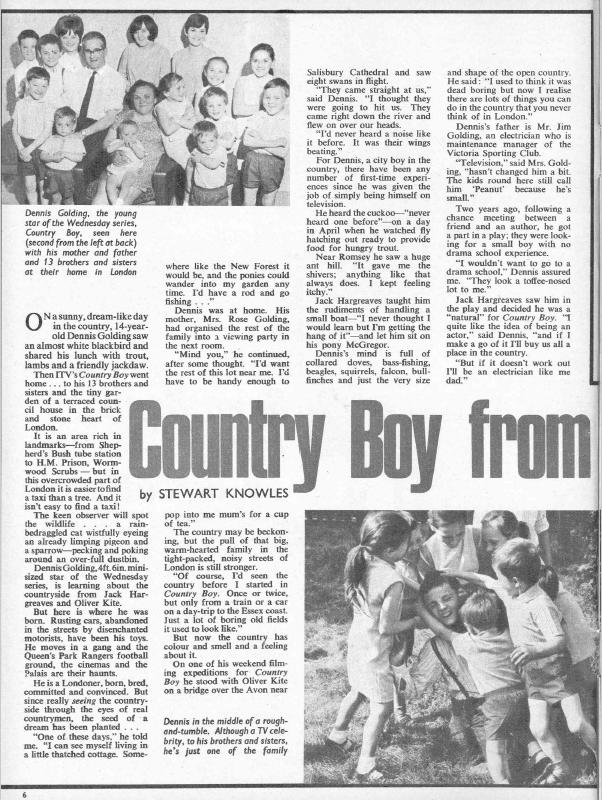 A couple of weeks ago we saw a preview of some of the new children’s programmes, one of which was Country Boy, so it’s nice to get a bit more information on it. Dennis Golding is a cockney lad who gets introduced to the ways of the countryside. Dennis is keen to point out he had seen the country before, ‘once or twice, but only from a train or a car on a day-trip to the Essex coast. Just a lot of boring old fields it used to look like‘. He has now seen swans, heard a cuckoo and learned how to handle a small boat. It’s wonderful to hear the lad gushing about how much it has opened up his mind and he is now keen to live in the country one day. Presently, he lives in a terraced house with his 13 brothers and sisters. He was spotted for Country Boy while performing in a play. Dennis doesn’t fancy drama school – ‘They look a toffee-nosed lot to me‘ – though likes the idea of being an actor, ‘But if it doesn’t work out I’ll be an electrician like me dad‘.
