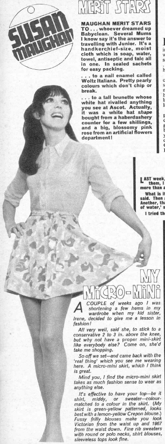 Susan Maughan dispenses more fashion advice. For a while now, she has been encouraging readers to cut off bits of skirts and dresses. The warmer weather is here and everyone should be embracing the fashion for shorter hemlines. It seems she has not gone short enough so far though and here she has turned to buying an actual mini skirt. It is so short, she has termed it a ‘micro-mini‘. Interestingly, on the same page of which she has been advising more comfortable nightwear for the warmer nights, she also suggests wearing a mini skirt with sweaters.