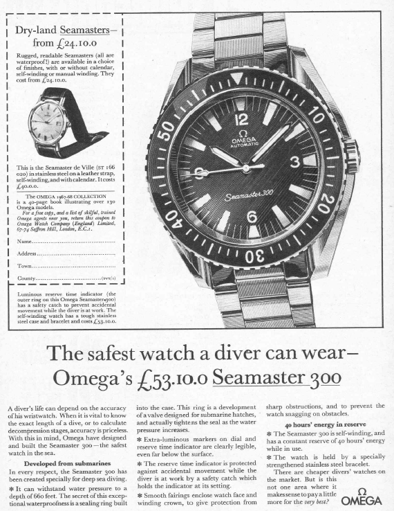 This is an absolutely stunning portrait of an Omega Seamaster 300. They really sell the benefits of this diving watch. Yet, for the most part, it is unlikely most wearers will spend very much time beneath the surface. They are simply very beautiful watches. Personally, that is enough for me. The Seamaster collection began in 1948 and the Seamaster 300 was first launched in 1957. Since 1995 the Omega Seamaster has been the watch of choice for James Bond and the brand now has strong links with the franchise. This Seamaster 300 costs £53.10.0 – approximately £891 in today’s money. A new Omega Seamaster 300 will currently set you back around £4400. If I could, I would.