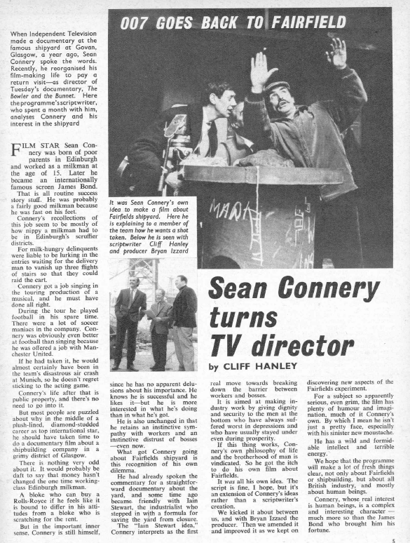 In 1967 Sean Connery worked for a month for free, directing and narrating a documentary on the Fairfield Shipyard in Glasgow. The Bowler and the Bunnet, referring to the different hats worn by workers and management, would turn out to be the only thing he ever directed. Connery had become interested in the experiment taking place there. He saw it as ‘the first real move towards breaking down the barrier between workers and bosses‘. This article actually tells us nothing at all about the experiment, probably hoping we will tune into the programme to find out. The article comments on Connery’s ‘sinister new moustache‘. He had grown the droopy tache for Shalako (1968), a Western to be released the following year, but was ultimately persuaded to shave it off before filming started. It also still references Connery as James Bond, indicating that he had yet to step down from the role. He would do so later that year before being persuaded to pick up his Walther PPK again for Diamonds Are Forever (1971) and $1 million.