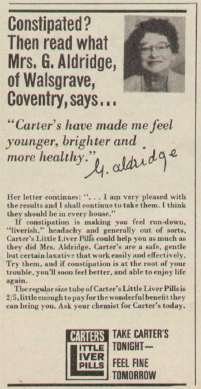 ‘Carter’s have made me feel younger, brighter and more healthy‘ says Mrs G. Aldridge of Walsgrave, Coventry. ‘Carter’s are a safe, gentle but certain laxative‘.