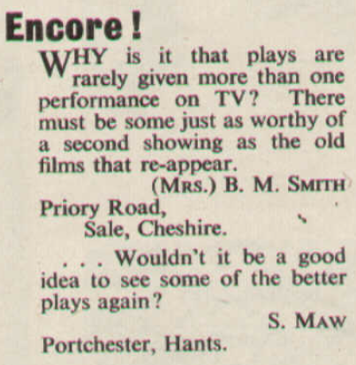 Repeats are few and far between in 1967’s TV Times. Actors’ contracts and limited broadcasting hours mean they provide little appeal to broadcasters. Children’s programmes are the most likely to be repeated, including the likes of Thunderbirds and The Adventures of Robin Hood. Also, in this issue, there are repeats of popular series, The Saint and The Avengers.