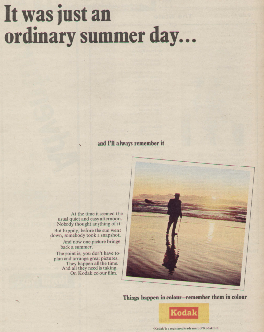 Although photography had been around for some time, it had been many years before portable cameras were available to the masses. Like television, it began in black and white and so manufacturers then have to try to push the benefits of paying more for colour film. There are few colour pages in 1967’s TV Times and even fewer colour adverts. The most likely candidates to pay extra for colour are tobacco companies and film or camera manufacturers. The Kodak adverts usually play on emotions and often contain photos of children. Even today, it is still the case that people start taking more photographs once they have children. This spur of the moment photo of a beautiful view with a figure in shadow is an interestingly slightly different take. Having the rest of the page in black and white also really draws attention to the colours.