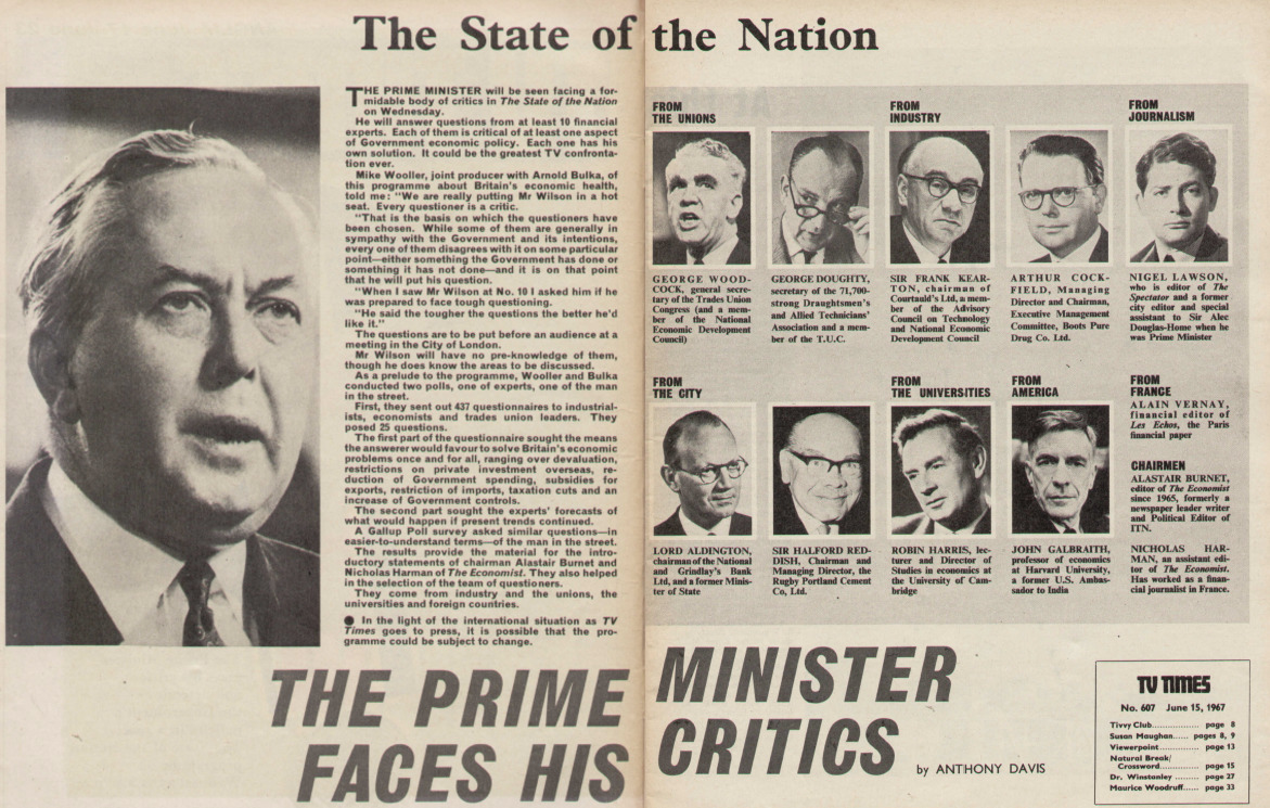 An article promoting The State of the Nation in which the Labour Prime Minister, Harold Wilson, will face tough questions on his economic policy. There will be questions from men from unions, men from industry, men from the City, a man from a university, a man from the press, a man from France, a man from America and from the man in the street.