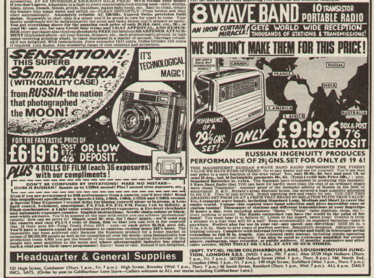 I love that the advert includes a map to show readers where Russia is but fail to label the UK on the map. ‘from RUSSIA – the nation that photographed the MOON!‘ ‘DON’T BE CONFUSED BY IMITATIONS! MAKE NO MISTAKE – OURS IS RUSSIAN!‘ I have some doubts about the Soviet Union’s technological prowess in consumer goods. An item described as ‘AN IRON CURTAIN MIRACLE!‘ and ‘NOT JUST A RADIO BUT TECHNOLOGICAL MAGIC!‘ just doesn’t inspire a great deal of confidence in me.