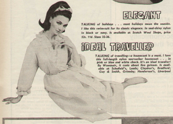 A singer, Susan Maughan enjoyed success throughout the 1960s and early 1970s. Her column in TV Times usually specifically addresses women and contains fashion, make-up and housekeeping advice. What else could a lady want… Here, she informs us ‘a housecoat is a must‘.
