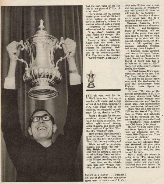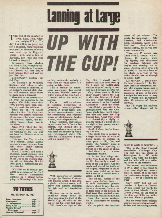 It’s FA Cup Final week and ITV are covering it – Tottenham Hotspurs and Chelsea. The BBC will be broadcasting the match too. Not many club matches were broadcast on television at all as there were still concerns about match attendance numbers. But the FA Cup Final provides the choice of both BBC and ITV’s coverage! Dave Lanning’s Lanning at Large segment is a regular feature of TV Times and this week he has been to visit the FA Cup trophy.