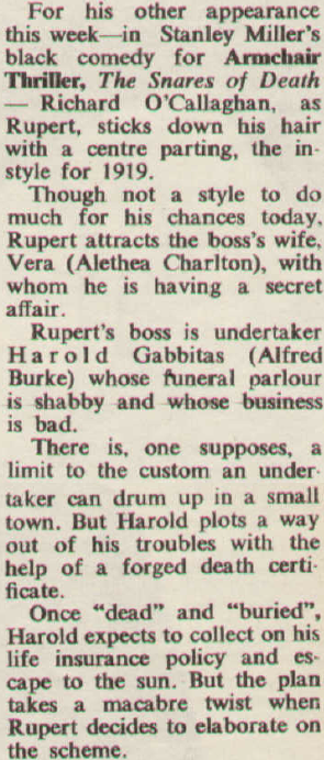 The other Richard O’Calloghan play alluded to in this preview is The Division, which goes out on Thursday. The Armchair Theatre previews in TV Times are often excellent like this. An increasingly frustrating problem presented here is finding out the episodes exist but are not released on DVD. However, we can present a colour photo of Alfred Burke printed in TV Times. This would often be the only way of seeing stars in colour. When I was watching Public Eye and first reached the colour episodes I was shocked to discover Alfred Burke had blonde hair as I had always presumed it to be dark! There are also a couple of colour photos from the set of ‘The Snares of Death’.