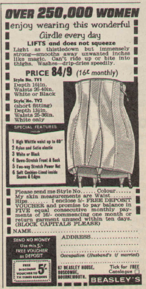 For only 16 shillings a month for five months, you could enjoy this ‘light as thistledown but immensely strong‘ Girdle. For who-only-knows-what-reason, they need to know your occupation or ‘Husband’s if married‘. Quite why you would need to know someone’s husband’s occupation before sending them a Girdle is beyond me.