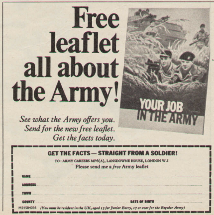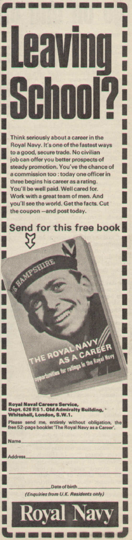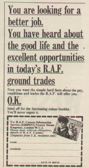 School leavers are invited to send for a book on the Royal Navy. The top line is appropriate for the time of year but virtually every issue of TV Times seems to have at least one advert for the armed forces. This one has three. National Service had only ended a few years before and though the armed forces were being reduced in size, there was still a need to woo young recruits in. Good prospects, decent pay, the opportunity to travel and learn a trade all usually feature in these adverts.