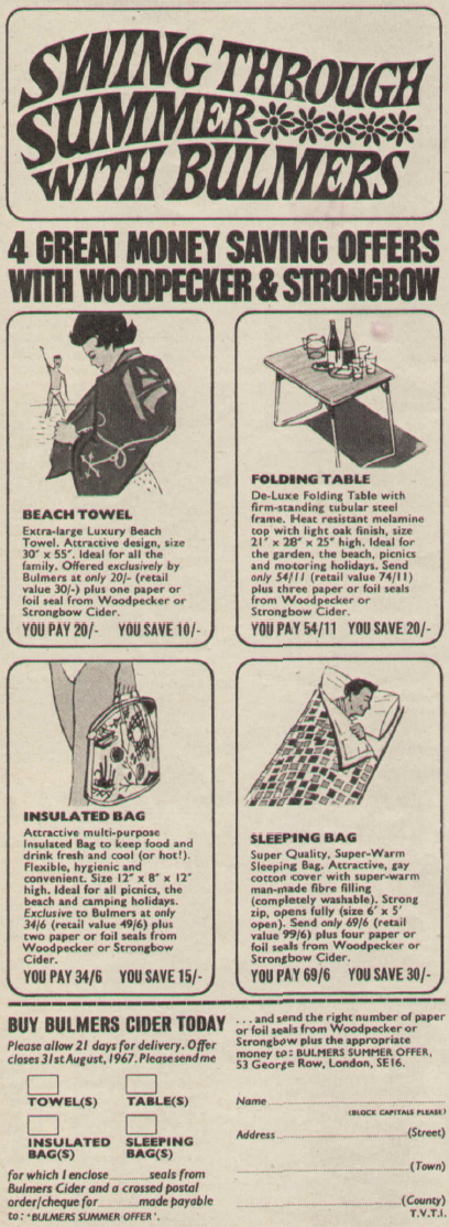 Send off the paper or foil seals and you can save money on a beach towel, a folding table, an insulated bag and sleeping bag. The sleeping bag has an ‘attractive, gay cotton cover‘. All you need to do is buy several, I presume, bottles of Woodpecker or Strongbow cider. I had never heard of Woodpecker. Wikipedia states sales to have declined by a third since 2001 and yet Sainsbury’s claims it to be the third biggest draught cider in the UK. Oddly, I am inclined to believe the former.