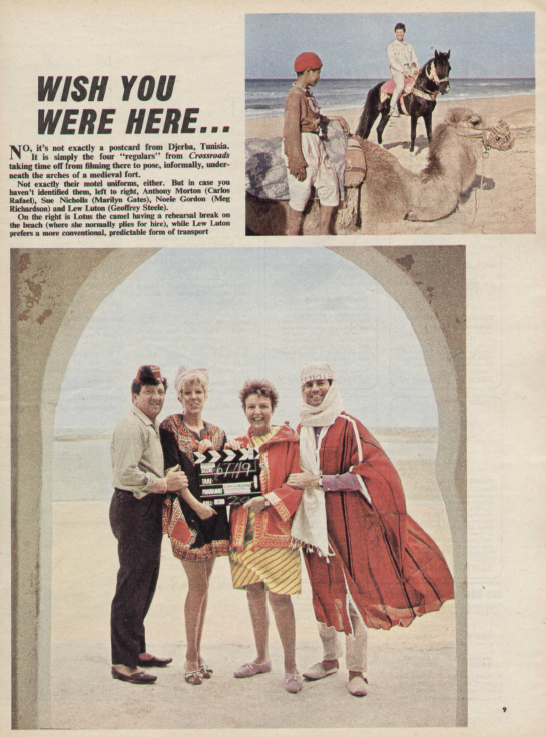 Four of the Crossroads regulars pose in Djerba, Tunisia, whilst taking a break from filming there. I am absolutely baffled as to how Crossroads ended up filming in Tunisia and the cast must have thought all their Christmases had come at once. How does a soap opera centred around a hotel in the West Midlands end up in Tunisia? We want some beach scenes – where shall we go? I grant you the West Midlands region is not awash with coastline. If we wanted to go to the beach for the day when I was a kid, it was at least a four hour round trip. However, though they may be slightly less beautiful, there are nearer sandy parts than Djerba, Tunisia.