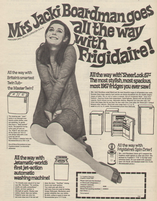 Ooh-er etc. The young lady looks ecstatic to be surrounded by drawings of modern white goods. Apparently there was the money for a photograph of her but alas, not of any of the products.