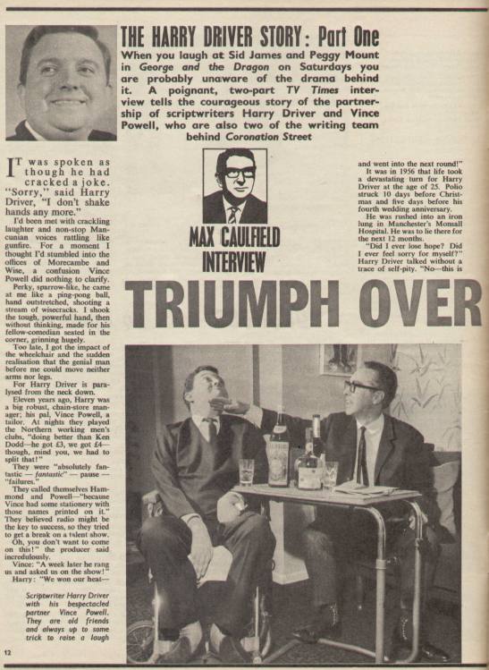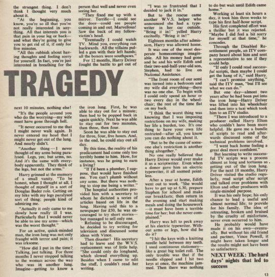 A scriptwriter for George and the Dragon as well as Coronation Street, Harry Driver discusses how he got his success. After contracting polio, Harry was paralysed from the neck down but eventually persisted to become a writer. Harry was 25 when he contracted polio, something that surprised me because I had only ever heard about polio being contracted by children. Harry’s descriptions of his suffering really convey what a terrible disease it is. ‘All this rubbish about having thoughts and feeling sorry for yourself. In fact, you’re just interested in breathing for the next ten minutes, nothing else!‘ He spent over a year lying in an iron lung, where the nurses fixed up a mirror so he could see who he was talking to and was able to watch television. Harry seems to have picked writing as one of the few jobs he could do despite being paralysed. He was very concerned about being able to provide for his young family. Overall, the picture painted is a devastating one. Harry may have made a success of himself, but there would be many who didn’t. It is odd to think of such a debilitating disease still being so prevalent up until the 1950s.