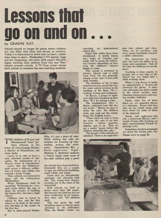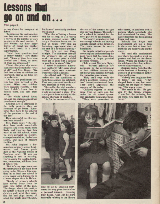 The children appear to flourish. John England, a headteacher and former president of the National Union of Teachers praises the schools, before going on to make a firm point. ‘But let’s get one thing straight. You can never take all the drudgery out of school work. At some point a child must get to grips with a subject or problem he doesn’t like.‘ An official from the Manchester Education Authority pointed out that most schools don’t have the resources of these two, which also both have far fewer pupils than most schools.