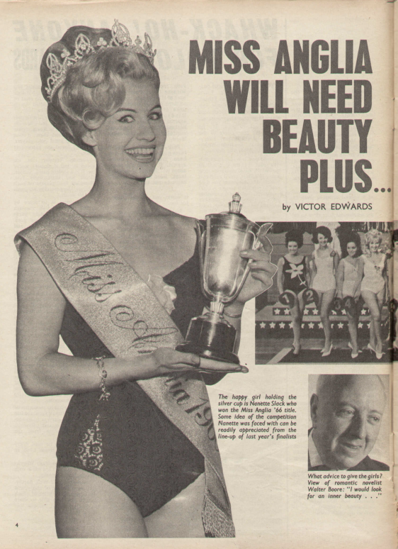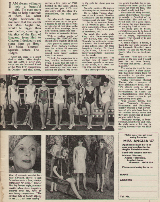 This article sets out to find some hints on ‘How – To – Make – Yourself – Sparkle – Before – The – Judges‘ for Miss Anglia ’67. I must say I am baffled by the whole beauty competition concept. Despite all the claims made in this article about personality and ‘an inner beauty‘, it all feels rather hollow. If it is genuinely considered at all, the comment that personality is there ‘to garnish your natural feminine appeal‘ makes it clear what really counts. Who wants a garnish?
