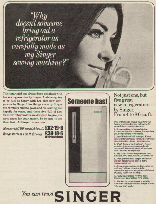 ‘Someone has!‘ Although the name is usually associated with the sewing machine, it appears Singer branched off into other products. Fridges seem a rather bold move but ‘You can trust SINGER‘.
