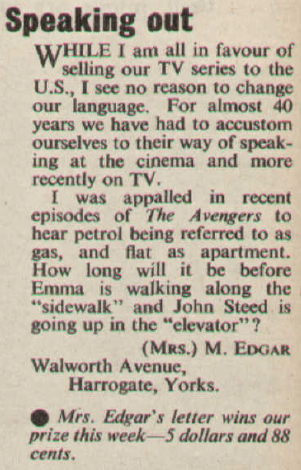 (Mrs) M. Edgar of Harrogate, Yorks. is appalled at the use of Americanisms in The Avengers as she heard ‘petrol being referred to as gas, and flat as apartment‘. TV Times takes a sarcy tone, saying she wins the prize letter for that week. Her prize? ‘5 dollars and 88 cents.‘