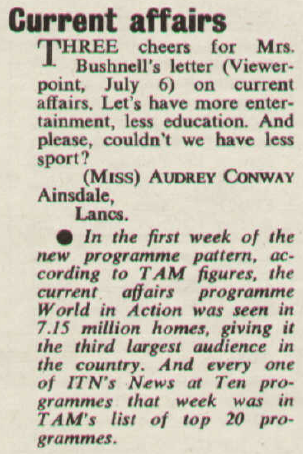 Miss Audrey Conway of Ainsdale, Lancashire, wants ‘more entertainment, less education‘. She also wants ‘less sport‘ though she neglects to provide any reasons for either of these requests. The letter she refers to was in the July 8th issue, not 6th as printed. A Mrs S.E. Bushnell of King’s Park Road, Bournemouth, stated she and her husband did not want to be more informed on current affairs because ‘Our already jangled nerves do not deserve to be tensed even more by contentious arguments on political and foreign issues which we have already read and discussed fully in working hours‘. I don’t think I have ever known anyone who could say they have fully read and discussed political and foreign issues in their working hours. Mr and Mrs Bushnell are clearly either both journalists or civil servants.