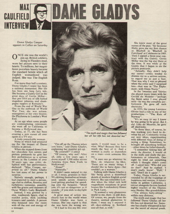 She is described as ‘a national monument‘, a nice change from the overused ‘national treasure’ we have today. Caulfield was expecting someone rather grand and was instead ‘greeted by a slim, tomboyish figure‘. She is going ‘up the Thames‘ after the interview. A few years previously, Dame Gladys had driven herself 3,500 miles from New York to Hollywood. ‘“Alone?”‘ asked Caulfield. ‘“Naturally”‘ came the reply.