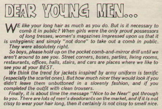 The one insistence of Susan’s that is really necessary is her final one, ‘There are lots of men’s deodorants on the market, and if it is not cissy to wear your hair long, then it certainly is not cissy to smell nice‘.