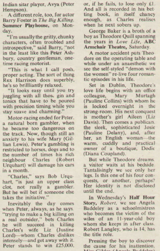 Philip Mackie has written this week’s Summer Playhouse. ‘The Big Killing’ has an interesting-sounding plot of a man betting his neighbour he can get away with killing the neighbour’s wife. Barry Foster stars and clearly relished playing against type as ‘this is what I call posh, proper acting‘. He faced up to the challenges that come with this. ‘It looks easy until you try juggling with all those gin and tonics that have to be poured with precision timing while you stay suave and charming‘.