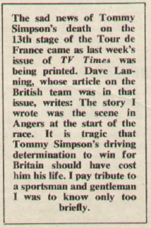A short note about the death of cyclist Tommy Simpson shortly before the last issue was printed. Tom Simpson died during the Tour de France, with an official death given as ‘heart failure caused by exhaustion’. Simpson had been suffering from diarrhoea and had diuretic amphetamines and alcohol in his system when he died. Footage of his death was broadcast live on French television. A memorial stone now exists at the point where he fell.
